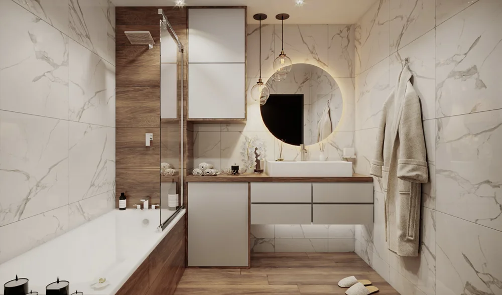 Дизайнеры выбирают крупный керамогранит для создания эффекта монолита без швов или с минимальными зазорами. Это визуально расширяет пространство, особенно в маленьких квартирах или узких коридорах. Материал может как служить неброским фоном, так и создавать выразительный акцент.