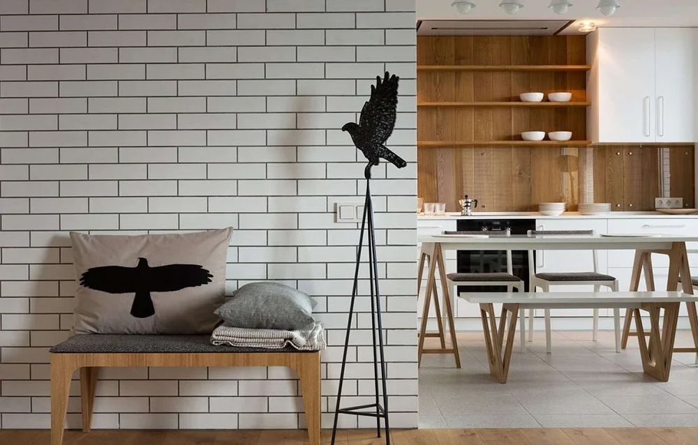 В дизайне кирпич добавляет пространству характер, индустриальный шарм и текстурную выразительность. Чаще всего используется в акцентной зоне в гостиной, на кухне или в прихожей. Беленый кирпич визуально «разгружает» интерьер, темный — создает драматизм. Важно учитывать, что рельеф собирает пыль, поэтому на кухне лучше выбирать гладкие варианты оформления.