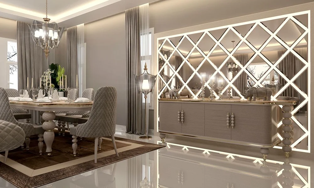 Это ключевой элемент ар-деко, хай-тека и минимализма. В скандинавском интерьере их используют сдержанно, в виде вставок или узких панелей. Сочетаются с микроцементом, деревом и штукатуркой.