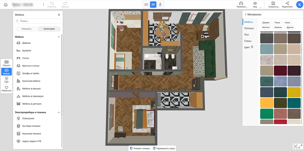 При переходе в 3D открывается значительно больше возможностей. Тут видны конкретные дизайнерские решения. Например, на пол ради создания целостного пространства во всех комнатах уложили ламинат елочкой. А вот мебель сделали акцентной. Например, в гостиной поставили изумрудный диван, в спальне и детской использовали горчичный цвет в текстиле, а в кухонном гарнитуре эти оттенки объединились.