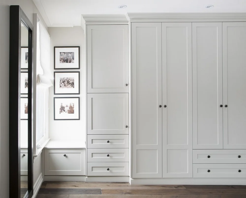 Чтобы получить шкаф до потолка, можно приобрести готовый стеллаж и закрыть просвет с помощью гипсокартона. Так вы и избавитесь от пыли наверху, и снизите визуальный шум. Еще можно использовать натяжные потолки, которые позволят уменьшить зазор.