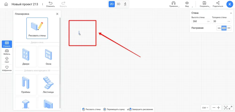 В меню «Строить» кликните по кнопке «Рисовать стены».