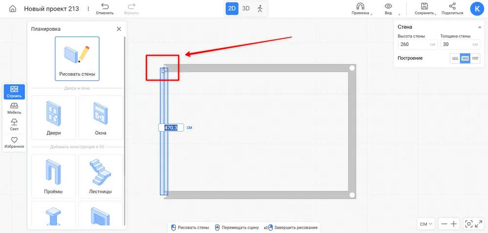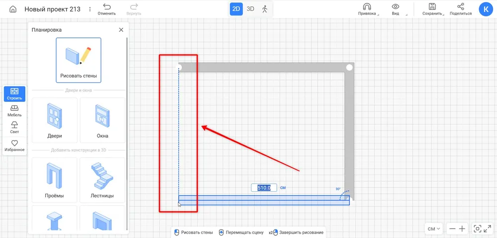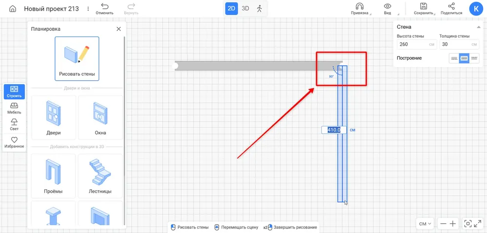 Снова выберите режим «Рисовать стены». Наведите курсор на существующую стену в том месте, где должна начинаться перегородка. Нажмите левую кнопку мыши. Проведите линию в нужном направлении, щелкните ЛКМ, чтобы зафиксировать конец перегородки.