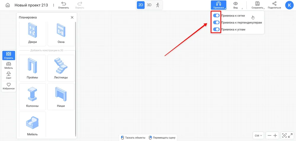 Привязка к перпендикулярам — при построении комнаты или новой стены появляется пунктирная линия. Этот маркер притягивается к узловой точке и помогает выровнять объект.