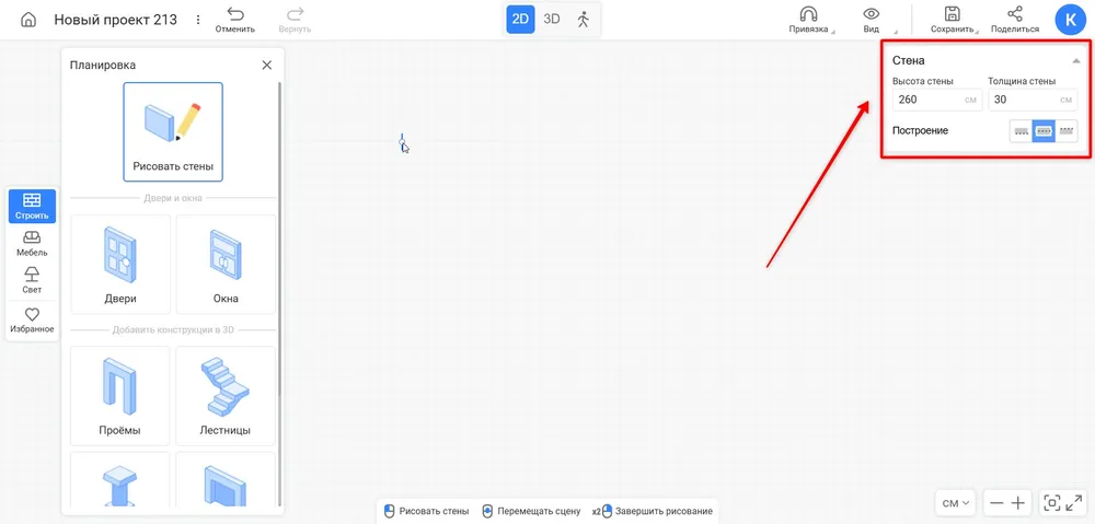 Задайте параметры в появившемся окошке. Отрегулируйте высоту и толщину стен с помощью стрелок. Минимальный шаг — 1 см. Также вы можете вписать значения вручную.