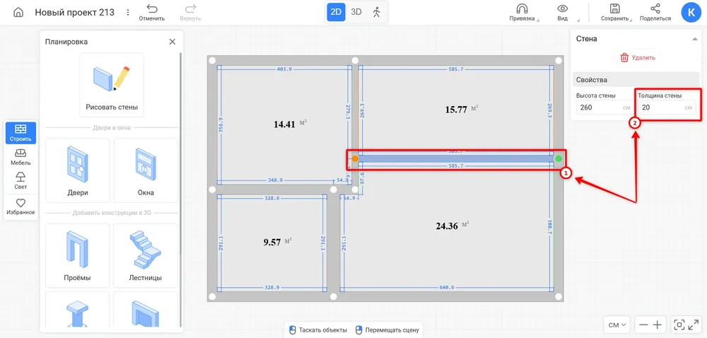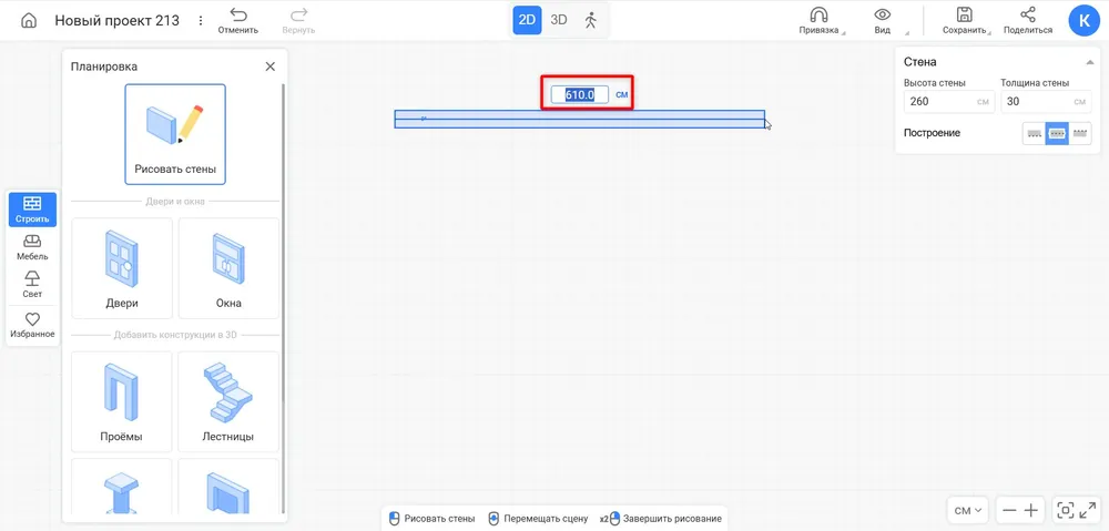 Чтобы изменить толщину перегородок, выберите линию и впишите нужные значения. Необходимо будет задать ширину каждого отрезка, чтобы вы смогли в точности повторить схему вашей квартиры.