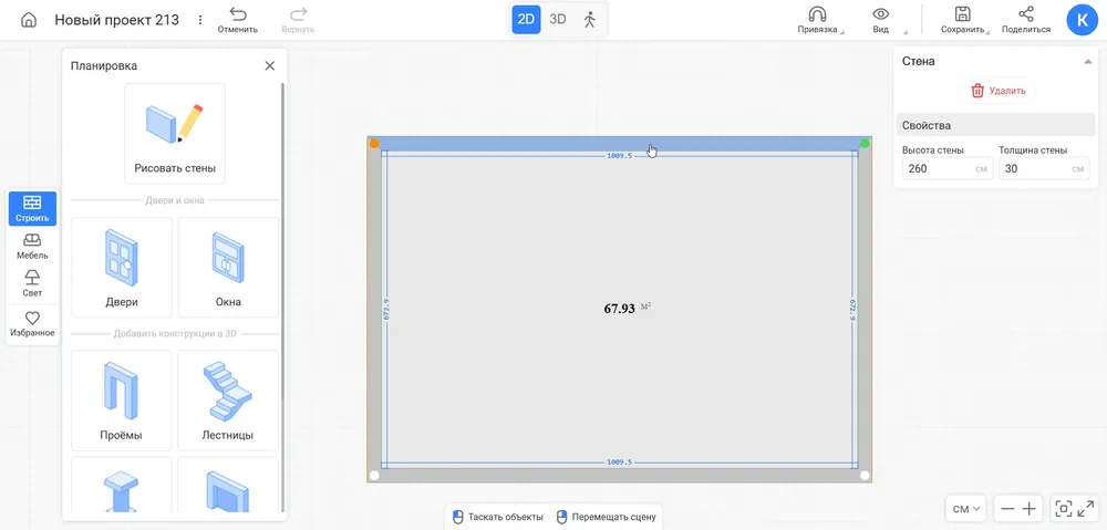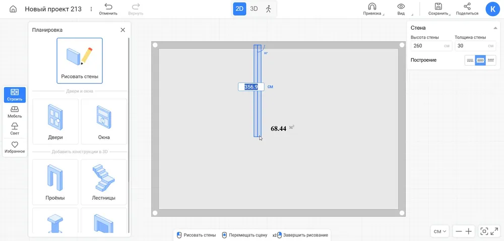 Если вам необходимо скорректировать размеры после построения, наведите курсор на нужную стену, зажмите левую кнопку мыши и потяните в сторону. Система автоматически отобразит новую площадь и длины стен. Используйте масштабирование колесиком, чтобы контролировать размер комнаты. Чем ближе сцена — тем меньше шаг изменения.