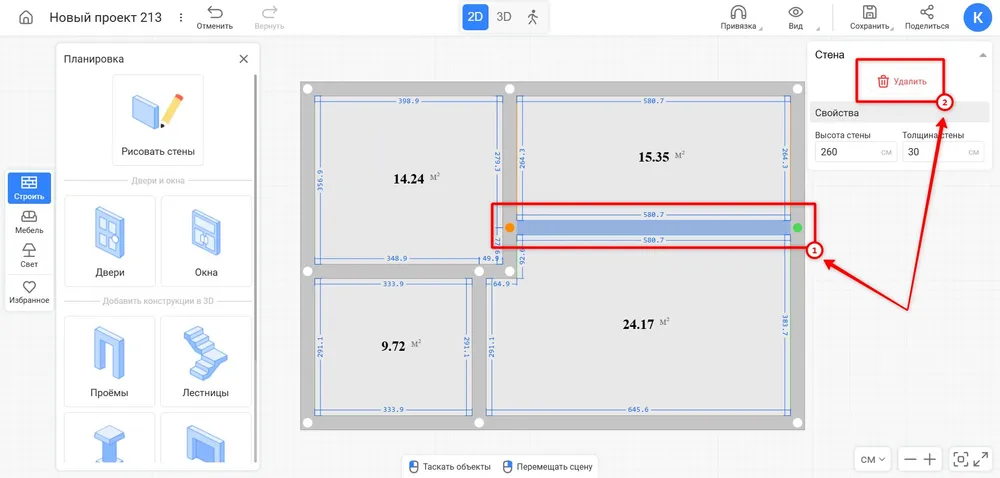 Если стену нужно удалить, выделите ее и нажмите на соответствующую кнопку или клавишу «Delete».