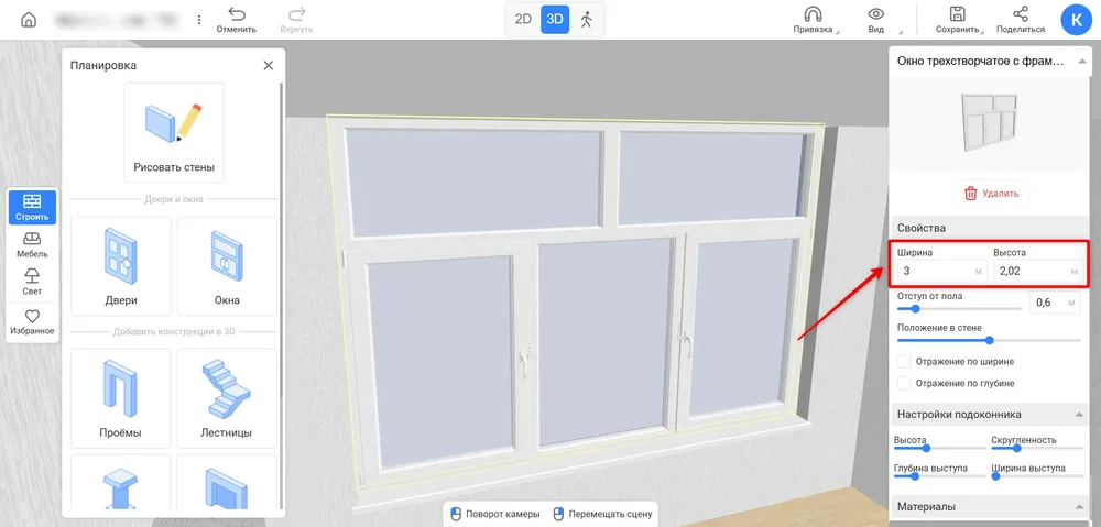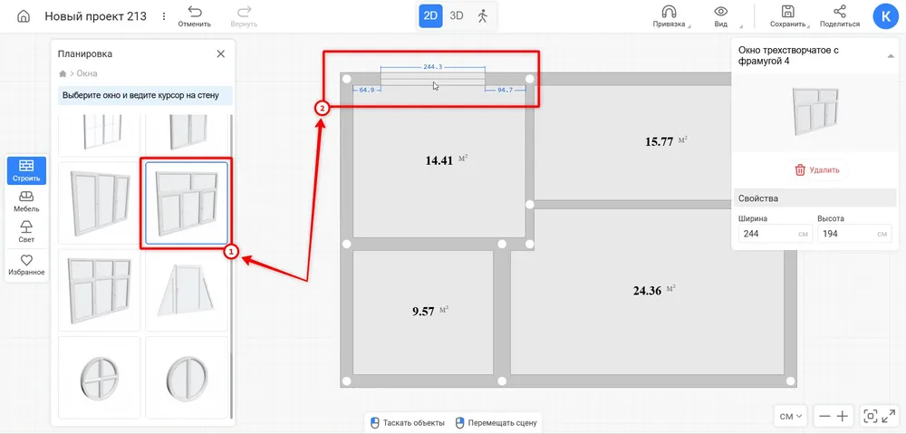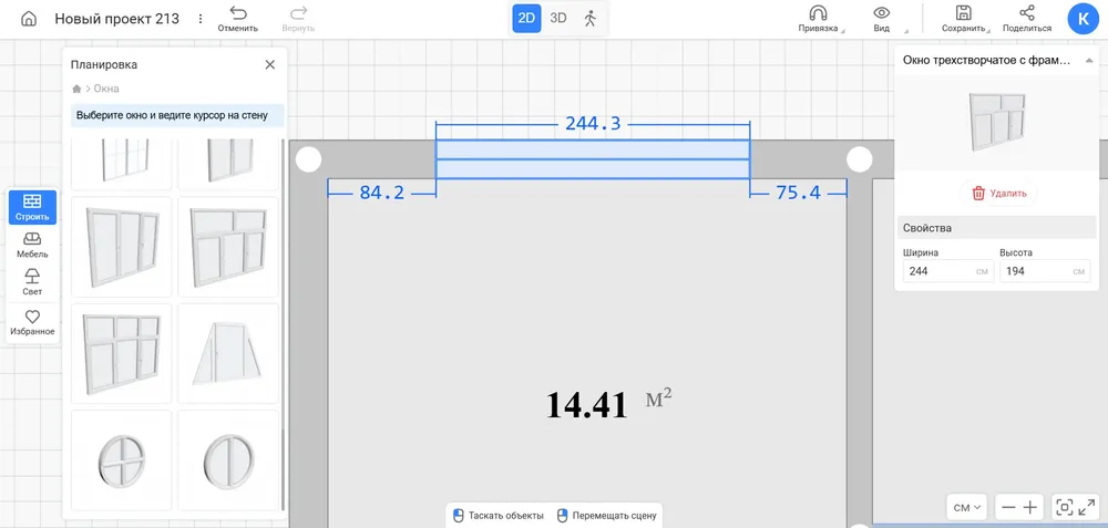 Система автоматически считает, сколько сантиметров остается от стены до окна. Так вы легко сможете поставить проем на свое место.