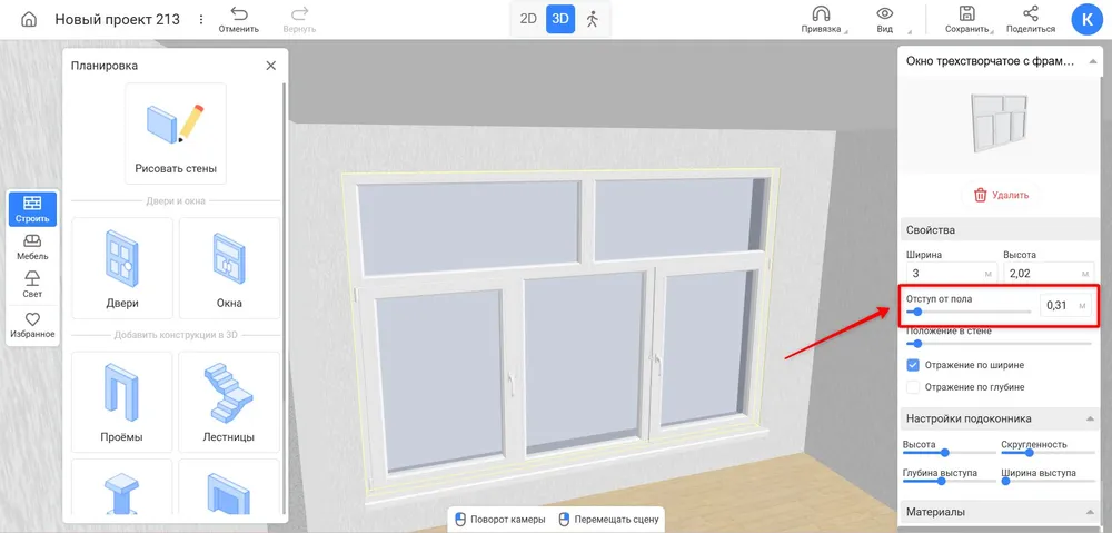 Перейдите к параметру «Отступ от пола». Переместите маркер влево, чтобы опустить окно ниже, или передвиньте вправо — чтобы поднять. Необходимое расстояние также получится вписать самостоятельно либо задать стрелками.