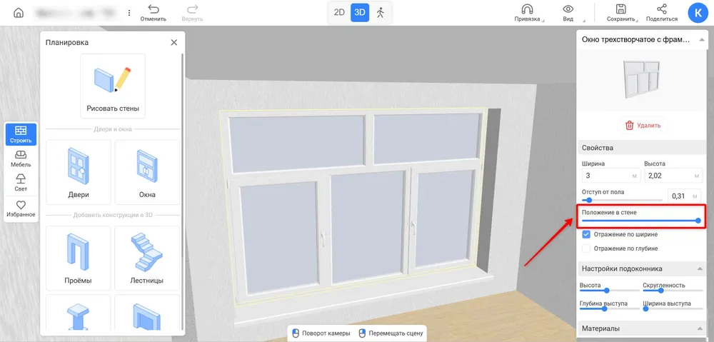 Отрегулируйте положение окна в стене. Если потянуть маркеры в стороны, глубина проема будет уменьшаться или увеличиваться.