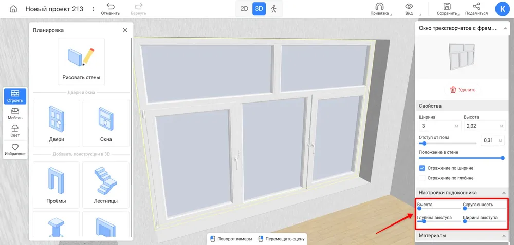 Настройте высоту, закругленность, глубину и ширину выступа у подоконника. Сделайте тонкий вариант, вровень с окном или широкий с ушками.