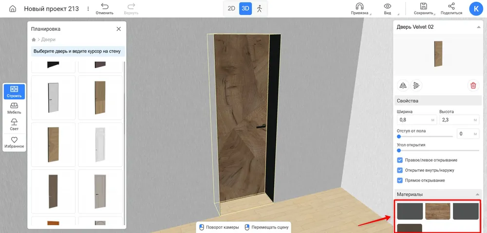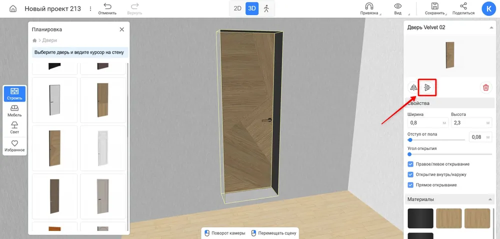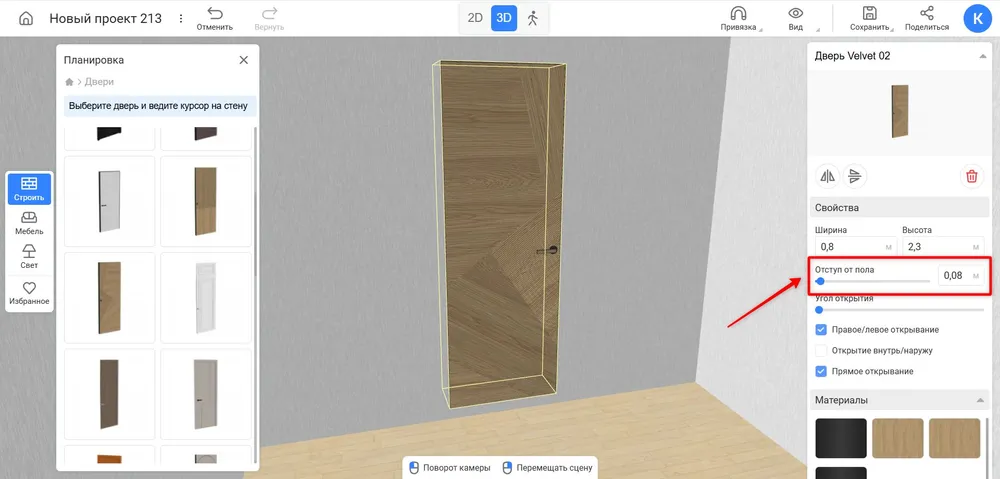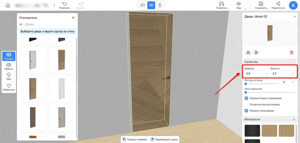 Смените вид просмотра на 3D-режим и кликните по двери. Измените высоту и ширину проема. Здесь аналогично можно воспользоваться стрелками или вписать необходимое значение вручную.