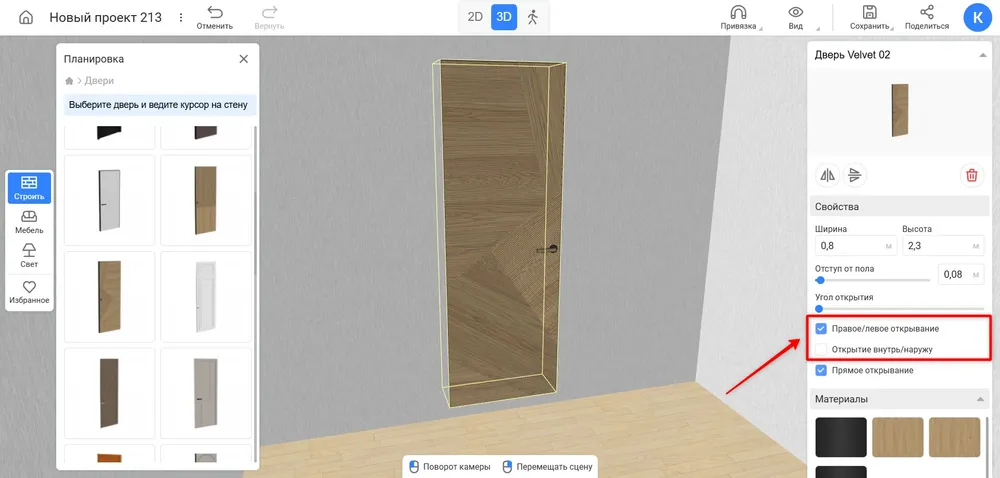 Параметр «Прямое открывание» влияет на возможность распахивать двери. Если галочка поставлена, то максимальный угол будет 180 градусов, если убрана — 90.