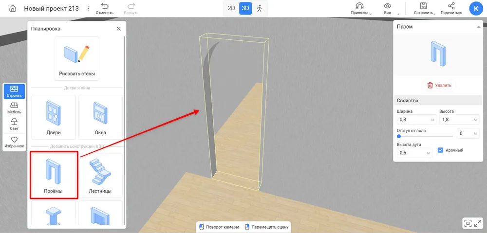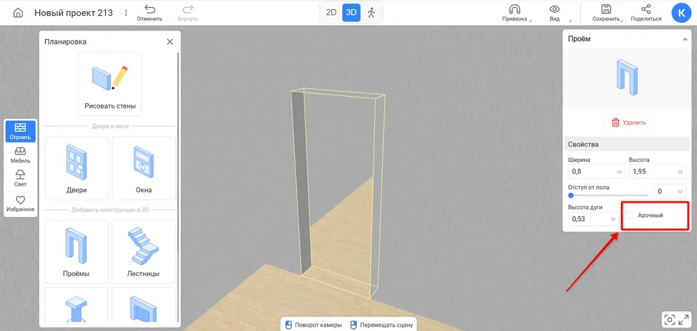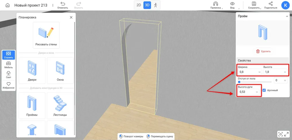 В окне параметров настройте ширину и высоту прохода. По умолчанию проем арочный. Вы можете скорректировать высоту дуги.