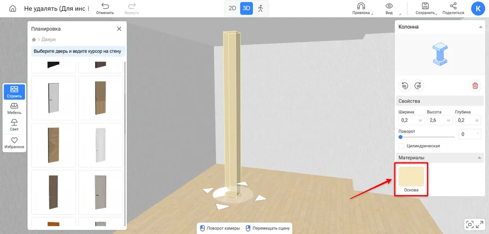 Зажмите левую кнопку мыши на опции «Колонна» и перенесите курсор на план. Чтобы установить модель в нужном месте, отпустите кнопку.