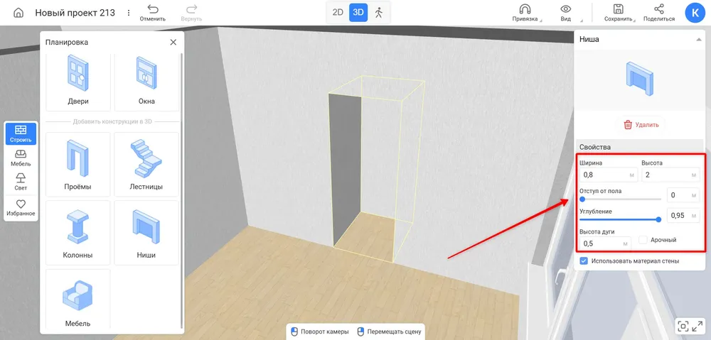 По умолчанию ниша арочная. Вы можете задать высоту дуги или убрать галочку «Арочный», чтобы сделать углубление прямоугольным.