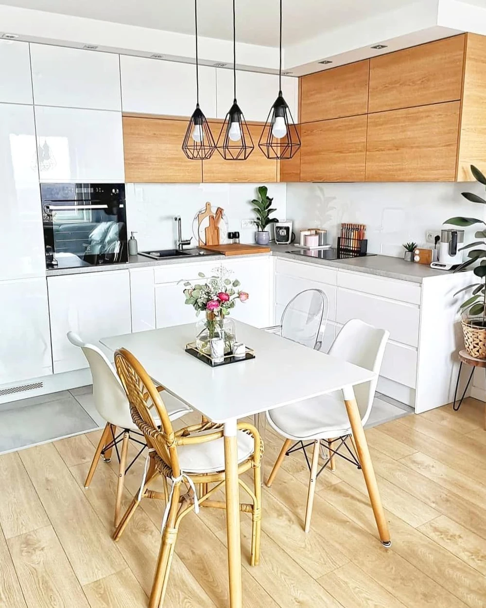 Позади острова разместили обеденную зону. В центре поставили круглый деревянный стол, а по бокам — стулья с белыми сидениями. Чтобы визуально разделить пространство, над зоной приема пищи повесили круглый синий светильник.