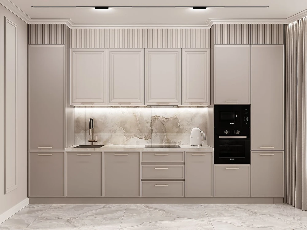 Чтобы соблюсти требования безопасности и сделать готовку комфортной, нужна столешница длиной от 3 м. Ширина прохода между гарнитуром и противоположной стеной должна составлять 120-150 см. Если у вас слишком маленькая кухня, задействуйте встраиваемую бытовую технику и откажитесь от распашных дверок в пользу выдвижных механизмов.