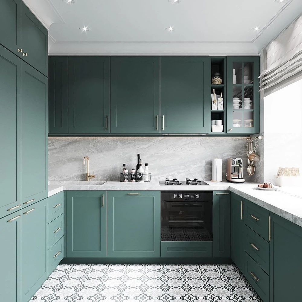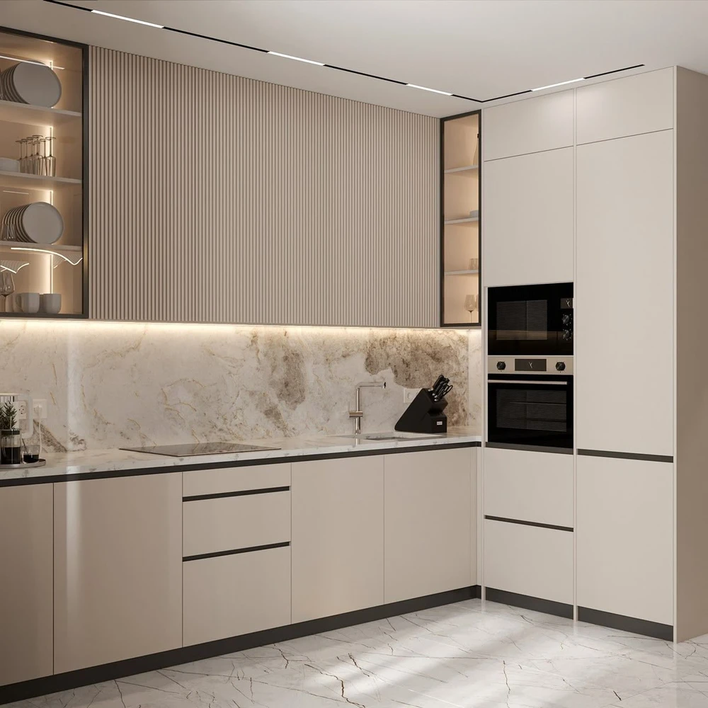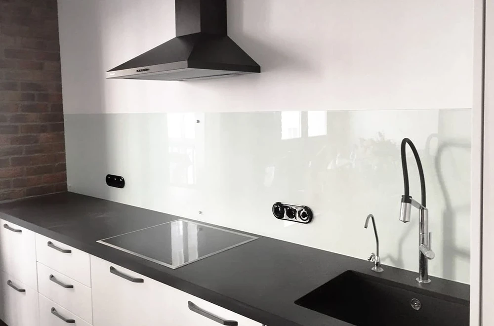 Для фартука оптимальны керамическая плитка и закаленное стекло. Кафель дает неограниченные дизайнерские возможности и легко заменяется при повреждении, а стеклянный фартук создает гладкую поверхность без швов, устойчив к жиру и влаге.