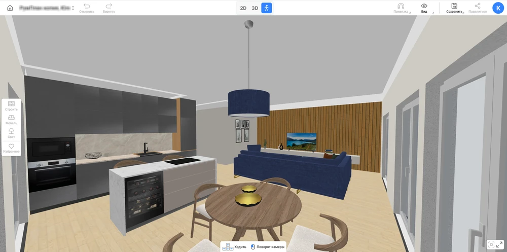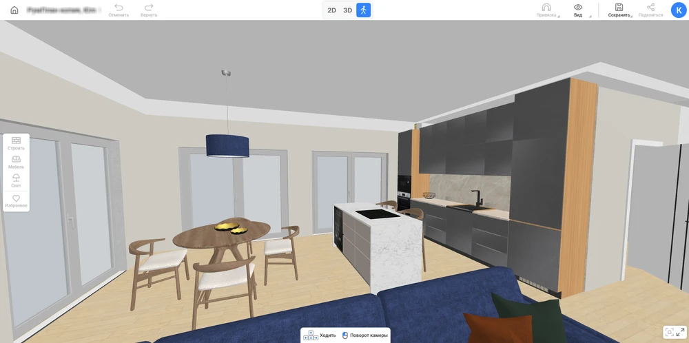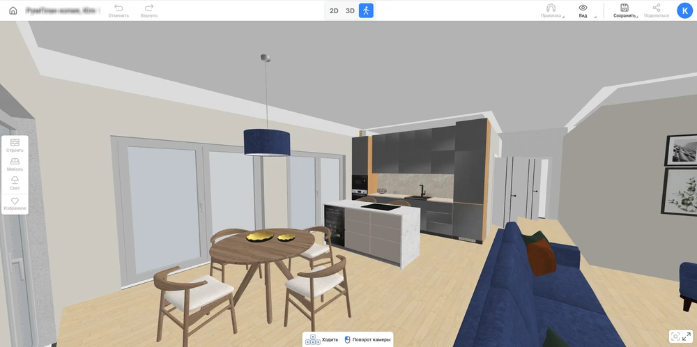 Если вы еще не знаете, как правильно спроектировать кухню, начните именно с выбора планировки. Чтобы упростить себе задачу, воспользуйтесь бесплатным сервисом для черчения, например RoomPlan 3D. Это простая программа, работающая прямо в браузере. Тут можно создать чертеж всей квартиры, а потом продумать отделку и наполнить помещения мебелью. В сервисе есть встроенный каталог на 800+ моделей размещаемых объектов и 1600+ отделочных материалов для стен и пола.