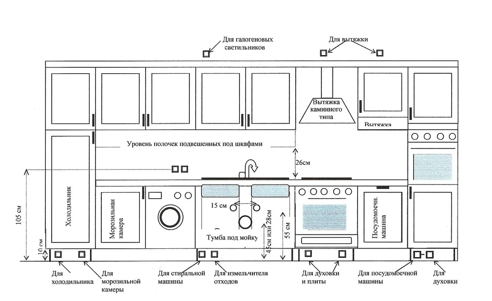 Распределите розетки по функциональным зонам. Над столешницей установите 3-4 точки на высоте 10-15 см от рабочей поверхности для подключения мелкой техники. Для электроплиты, духового шкафа и посудомоечной машины сделайте отдельные линии. В обеденной зоне разместите 2-3 розетки на высоте 30 см от уровня чистого пола. Не забудьте и про резерв. Добавьте несколько точек подключения на свободной стене на тот случай, если появятся дополнительные приборы.