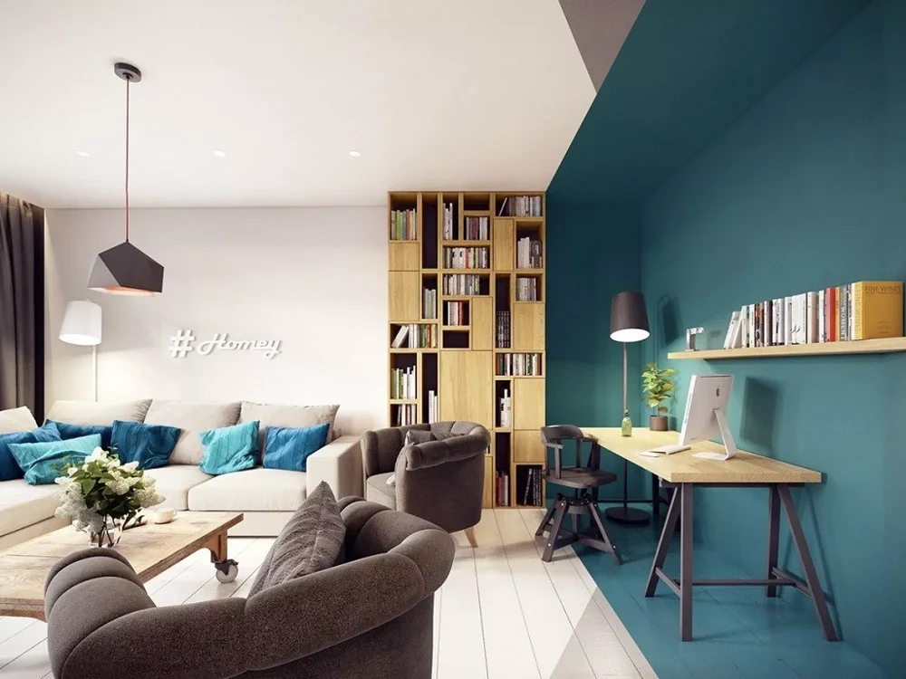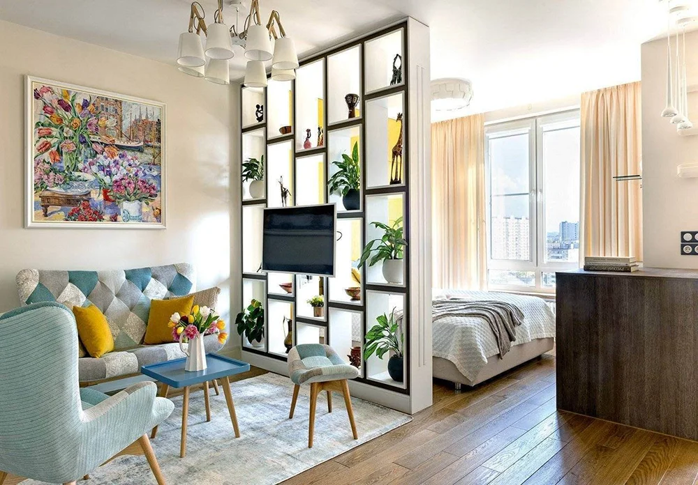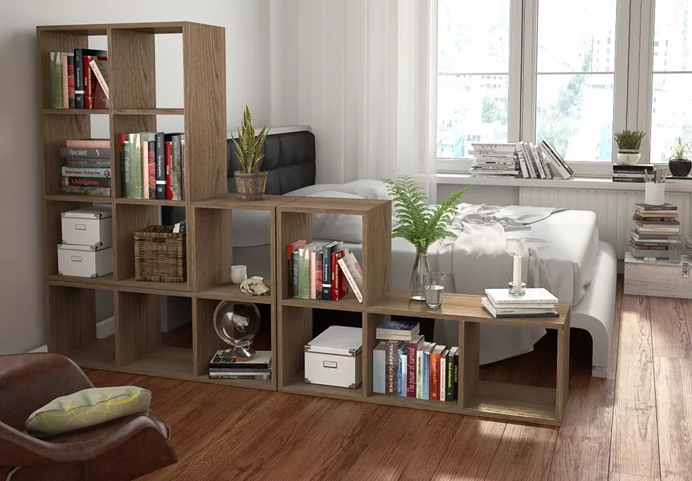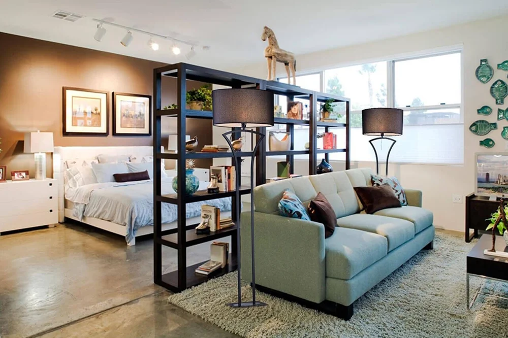 Разделение мебелью (стеллажи, диваны, барные стойки) — вариант, который отлично подойдет для квартир‑студий или больших пространств с единой площадью (кухня-гостиная, гостиная-спальня). Такой способ помогает разграничить зоны и, если использовать разный цвет, то визуально еще создать разные помещения внутри одного большого.