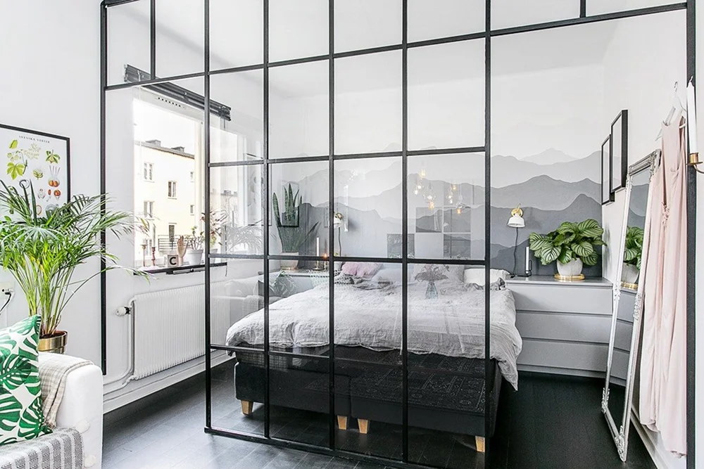 Стеклянные, матовые или металлические решетчатые конструкции — современное решение для тех, кто хочет четко разделить функции, но не терять ощущение простора. Они пропускают свет и отлично вписываются в лофт, минимализм и скандинавский стили интерьера.