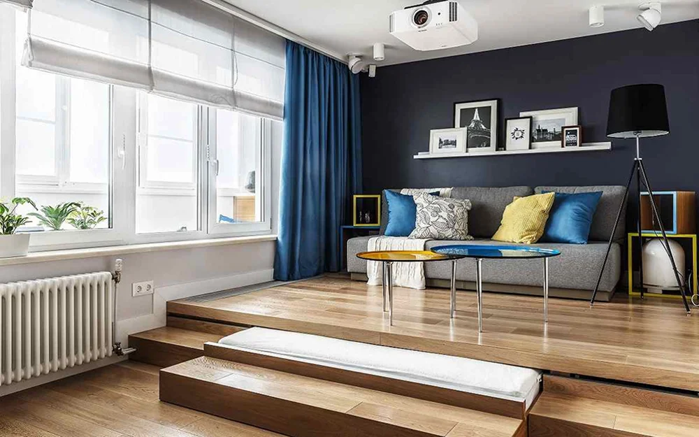 Такой прием уместен в помещениях с высотой потолков от 2,7 м. В типовых квартирах с низкими потолками подиум визуально «съест» пространство и сделает комнату давящей. Также стоит учитывать требования к безопасности. Перепад должен быть четко обозначен, особенно если в доме есть дети или пожилые люди.
