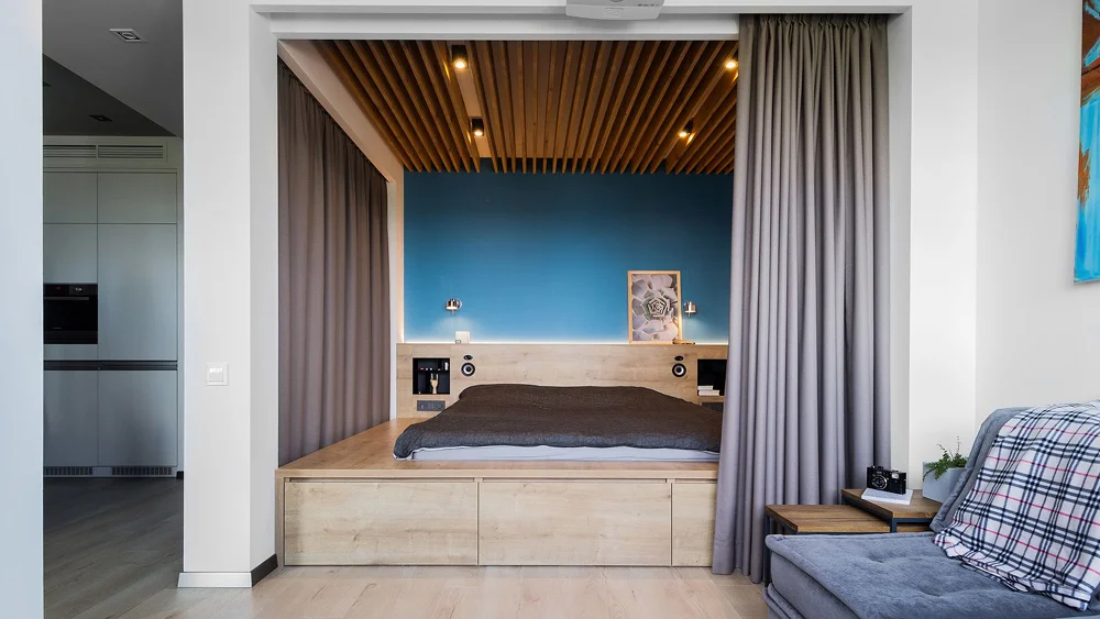 На подиуме можно поставить кровать, зону отдыха или даже мини-кухню. Под ним размещаются выдвижные ящики, технические ниши или скрытые системы хранения.