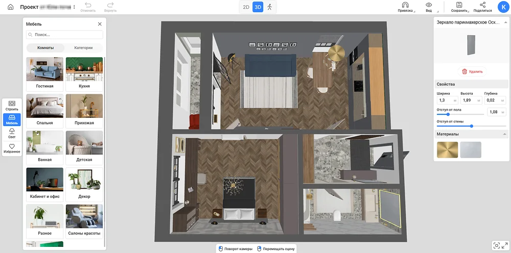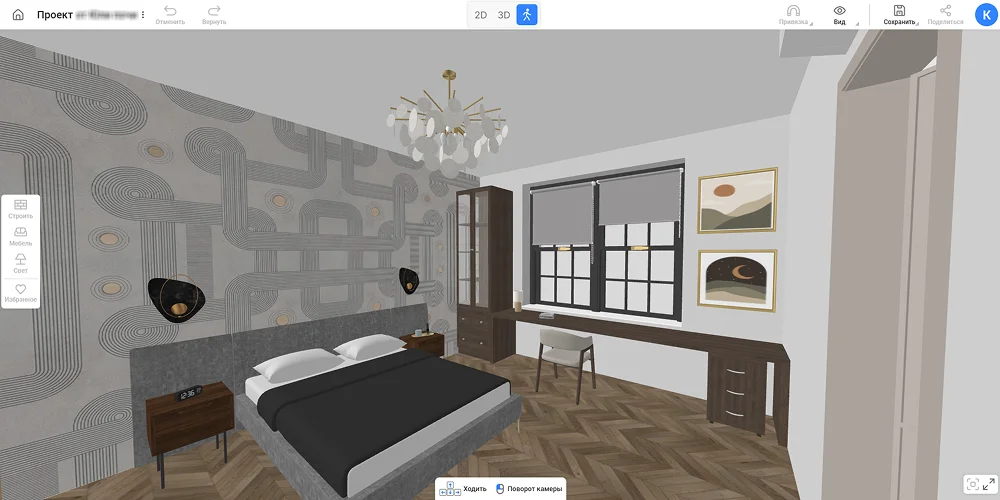 Когда сформируете идею, переходите на платформы для проектирования. В них можно нарисовать помещение любой формы, подобрать материалы, расставить мебель и декор. Удобный вариант — онлайн-сервис RoomPlan 3D с простым интерфейсом и бесплатными возможностями. В нем есть опции, чтобы начертить комнаты со сложной планировкой: нишами и колоннами. В каталоге свыше 1600 материалов для отделки и 800+ 3D-макетов мебели.