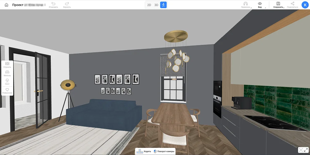 Начертите помещение с точными размерами в 2D, подберите текстуры и мебель в 3D, оцените результат в режиме прогулки.