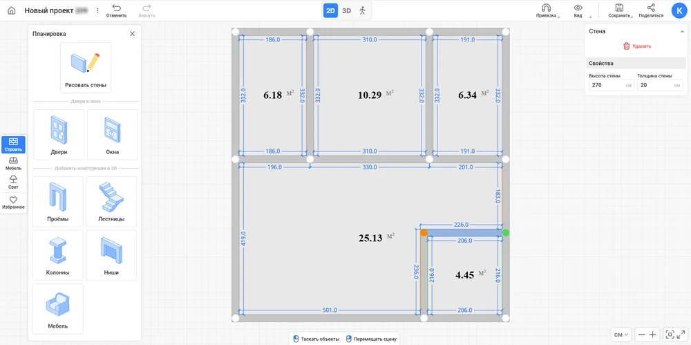 Создайте план помещения. Используя инструмент «Рисовать стены», начертите внешний контур бани. Если нужно, измените толщину конструкций, щелкая по ним и корректируя значения в окне свойств.