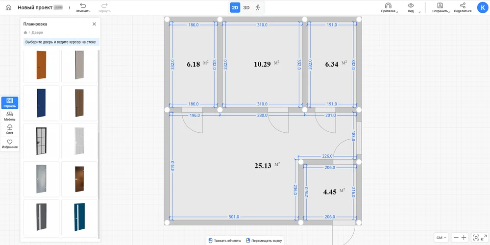 Добавьте двери и окна. Вначале разместите их в нужных местах стен, а потом поменяйте высоту, ширину и другие параметры. Это можно делать как в режиме 3D, так и на плоском плане. В каталоге есть множество вариантов окон и дверей, попробуйте разные. Если нужен проем нестандартного размера — не проблема. Просто отредактируйте габариты понравившейся модели через меню свойств. Там же можно перекрасить полотно и наличники.