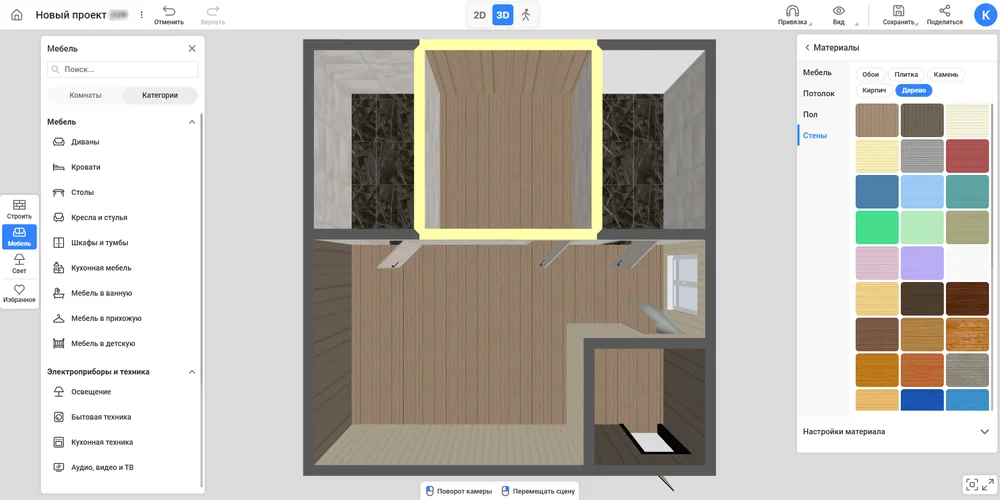 Продумайте отделку. Нажмите на пол или любую другую поверхность. Справа появится окно с настройками. В нем можно задать текстуры для внутренней и внешней стороны, откосов. Нажмите на кнопку с материалом и вы попадете в каталог онлайн-конструктора бани. Используя поиск и разделение по категориям, подберите вагонку, плитку, камень или другие текстуры для отделки потолка, стен и пола. Если нужно, поменяйте масштаб и угол укладки.