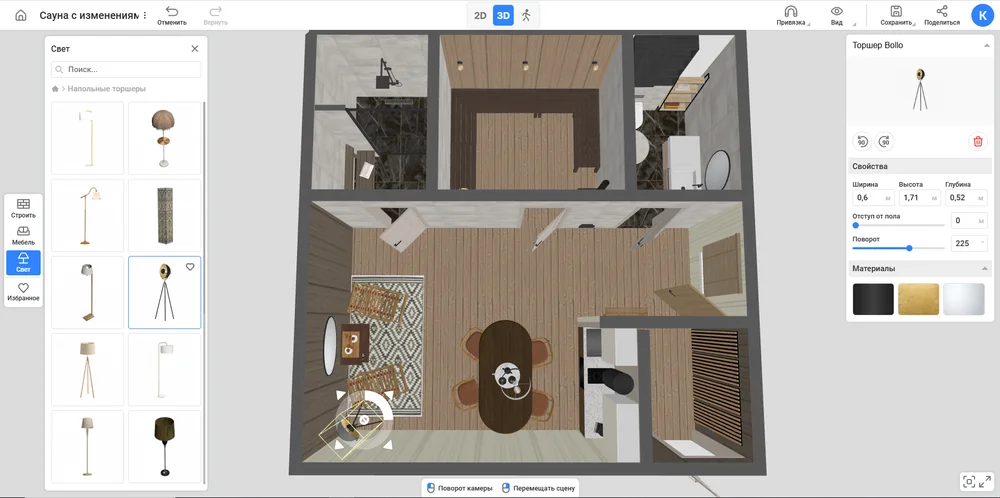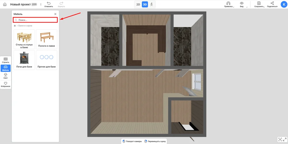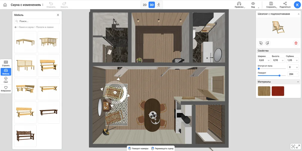 Сэкономить время на отрисовке объектов. В базе 1200+ моделей, любую из них легко редактировать. Мебель, техника и декор для бани вынесены в отдельную категорию, но остальными предметами тоже можно пользоваться при создании планировки.