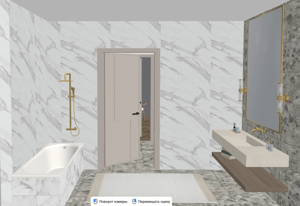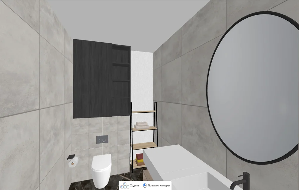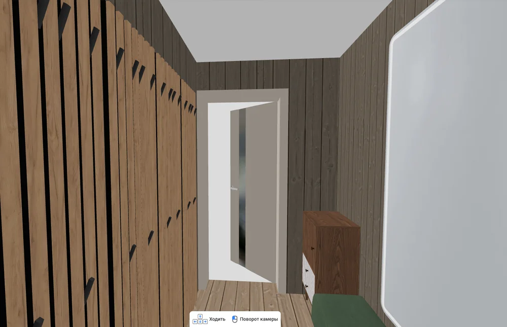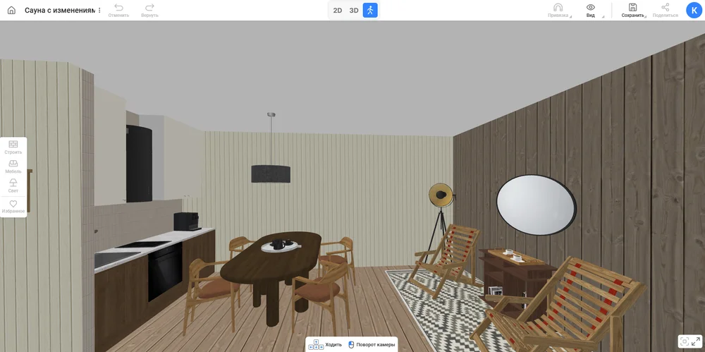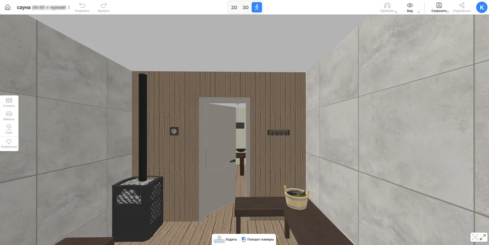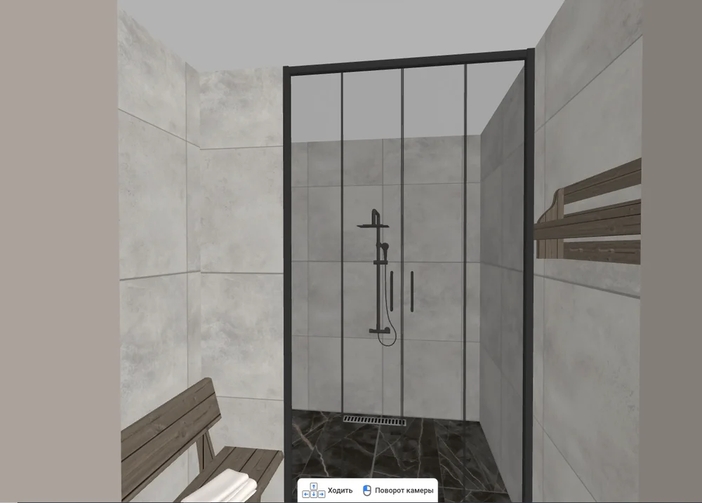 Оцените интерьер. Перейдите в режим прогулки с помощью кнопки с бегущим человеком в верхней части экрана. Пройдитесь по комнатам, посмотрите на результат. Если нашли ошибку или что-то не нравится, поменяйте и вернитесь сюда еще раз. Благодаря планировщику бани онлайн и поэтапному подходу вы избежите лишних затрат на переделки.