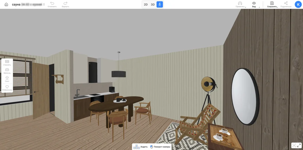 Визуализировать интерьер. Включив режим реалистичной графики, вы получите почти фотографическое изображение своей будущей сауны. А для большего погружения можно воспользоваться функцией виртуального визита и обойти все помещения от первого лица.